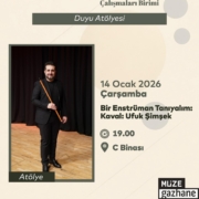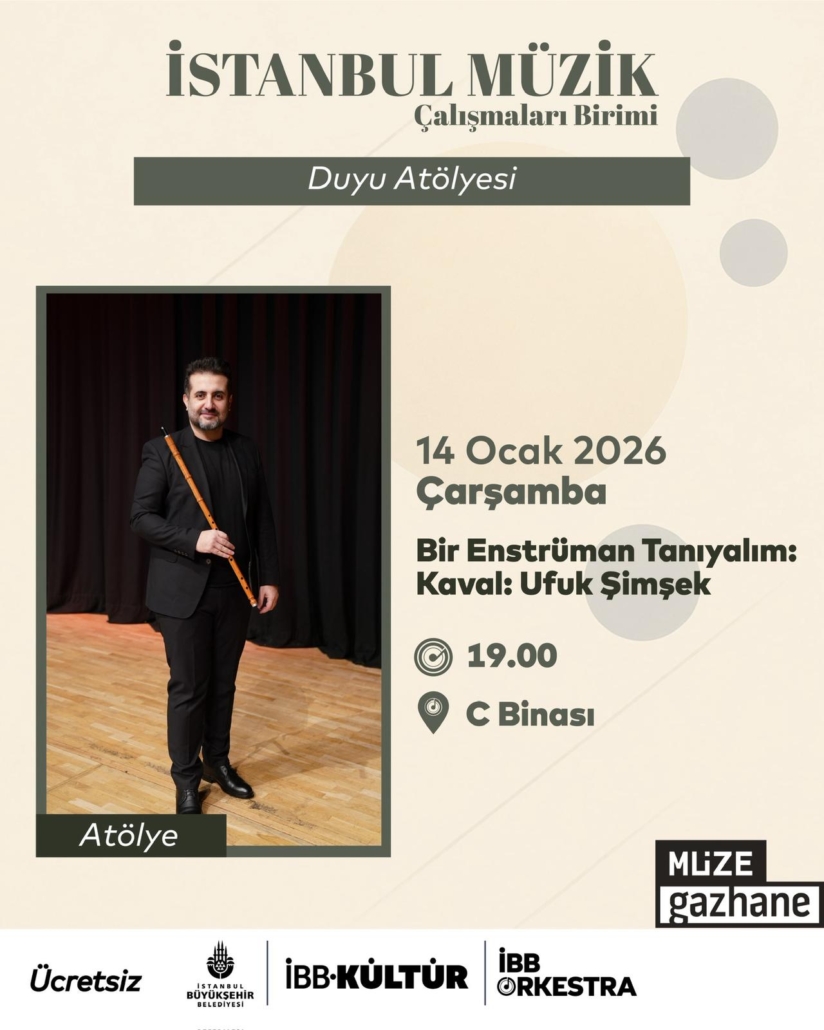 İstanbul Müzik Çalışmaları Birimi’nin Müze Gazhane’de her Çarşamba günü yürüttüğü Duyu Atölyesi programı kapsamında gerçekleşecek atölyenin konuğu İBB Orkestra Kaval Sanatçısı Ufuk Şimşek.