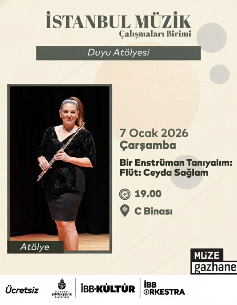 İstanbul Müzik Çalışmaları Birimi’nin Müze Gazhane’de her Çarşamba günü yürüttüğü Duyu Atölyesi programı kapsamında gerçekleşecek atölyelerin bu haftaki konuğu İBB Orkestra Flüt Sanatçısı Ceyda Sağlam.